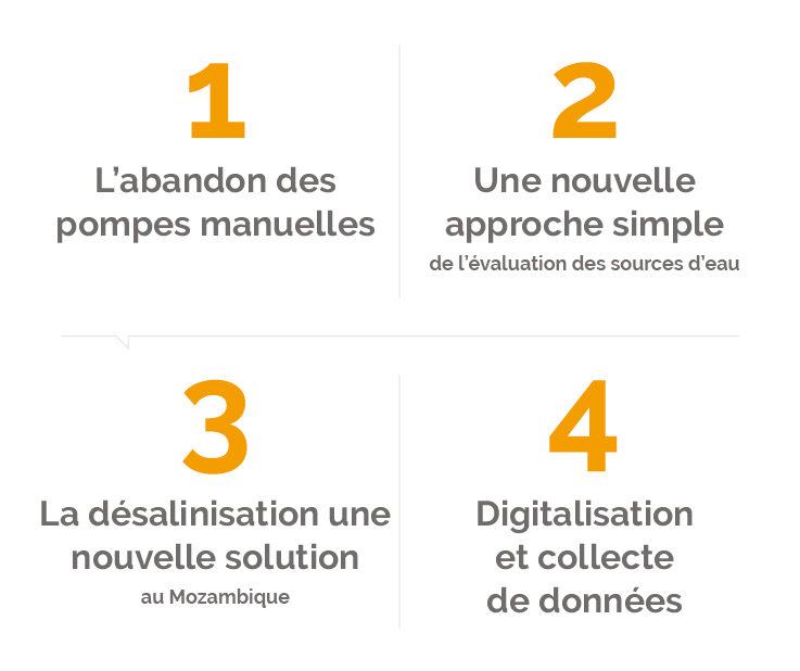 Il est essentiel d’abandonner les pompes manuelles puisqu’elles ne peuvent être installées que directement au-dessus des sources d’eau potable. Dans la province de Gaza, les sources d’eau douce sont souvent situées dans des lieux éloignés et ne sont pas facilement accessibles pour les habitants de la région. Le projet a permis d’installer, sur des forages contenant de l’eau potable, de nombreuses pompes électriques solaires qui ensuite remplissent à distance les réservoirs de communautés avoisinantes. L’approvisionnement direct de ces communautés grâce au pompage améliore de manière significative l’accès à l’eau.