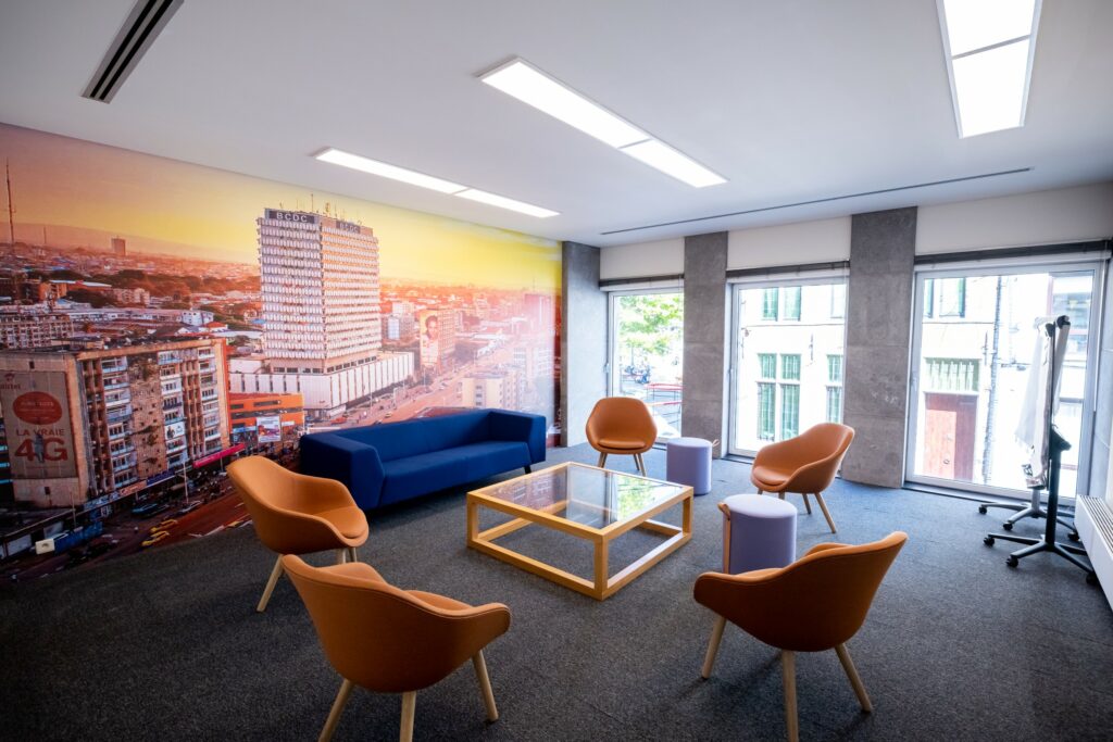 Moins de superficie de bureaux, mais plus de places et d’espace pour travailler ensemble, faire du brainstorming, se concerter au sein d’un environnement accueillant où chacun·e peut trouver une place où se sentir à l’aise. Le siège d’Enabel s’apparente en effet davantage à un bâtiment où il fait bon vivre, avec des coins salons, des fauteuils, des poufs, des tables basses et une cafétéria particulièrement bien réussie qui comprend un baby-foot. Il y a également des douches pour les navetteur·euses à vélo ainsi que des vélos électriques pour les déplacements dans la ville.