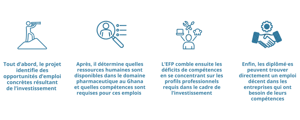 Concrètement, si une entreprise européenne prévoit d’investir dans l’industrie pharmaceutique, au Ghana par exemple, le projet peut contribuer à mettre à disposition les profils professionnels adéquats en suivant les étapes suivantes :