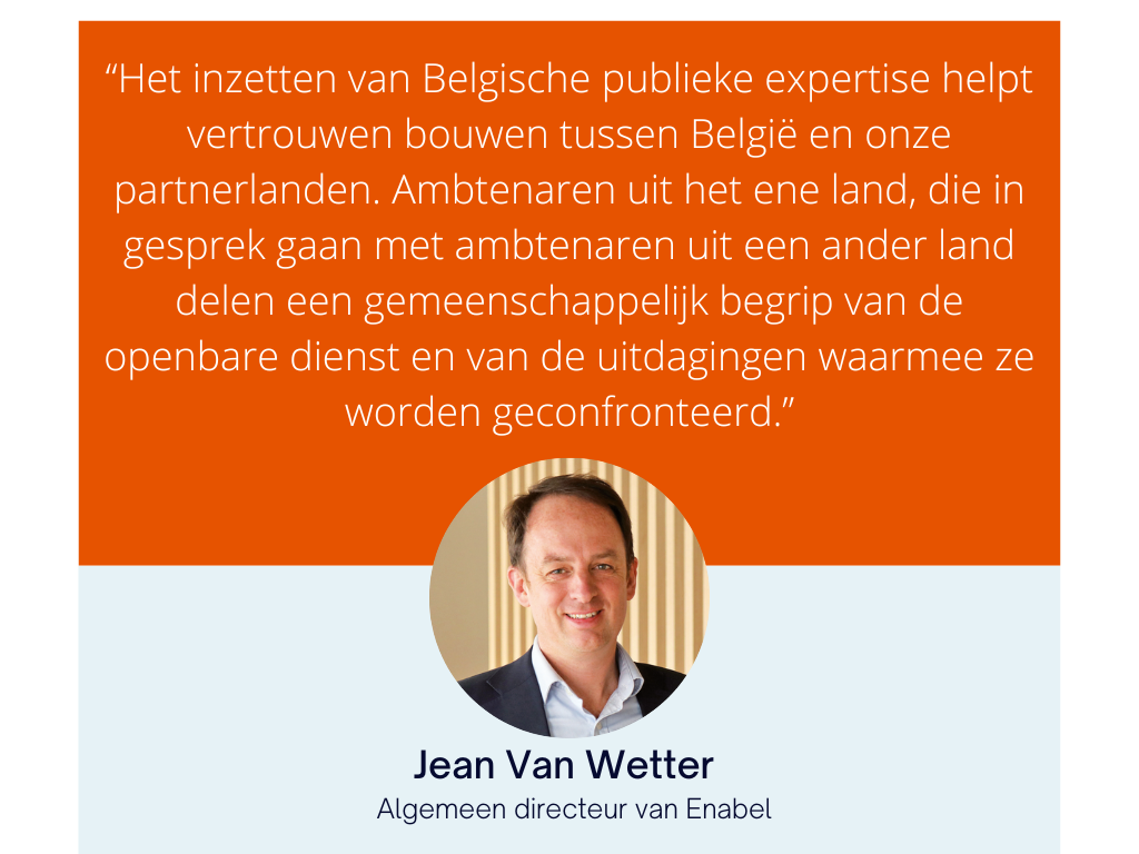 Vele overheidsinstellingen beschikken over unieke competenties die moeilijk te vinden zijn op de markt. Versterking van de publieke instellingen van onze partnerlanden staat centraal in de gouvernementele samenwerking die Enabel uitvoert. Daarom zijn uitwisselingen tussen peers in het kader van een ontwikkelingsproject van grote waarde. Hier treedt Enabel op als broker en biedt de context, relaties en opvolging voor expertise die vaak uitsluitend bij publieke instellingen terug te vinden is.
