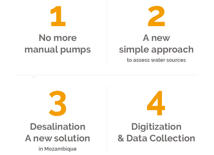 In case no fresh water can be found within the groundwater in a particular area, investments in desalination installations are to be made, especially when taking into consideration that Mozambique has 2500+ kilometres of coastline. The Belgian Development Agency is currently implementing its first desalination project in the Gaza Province.